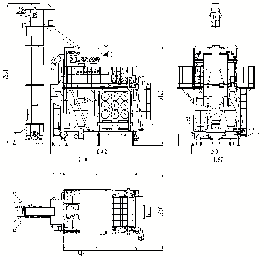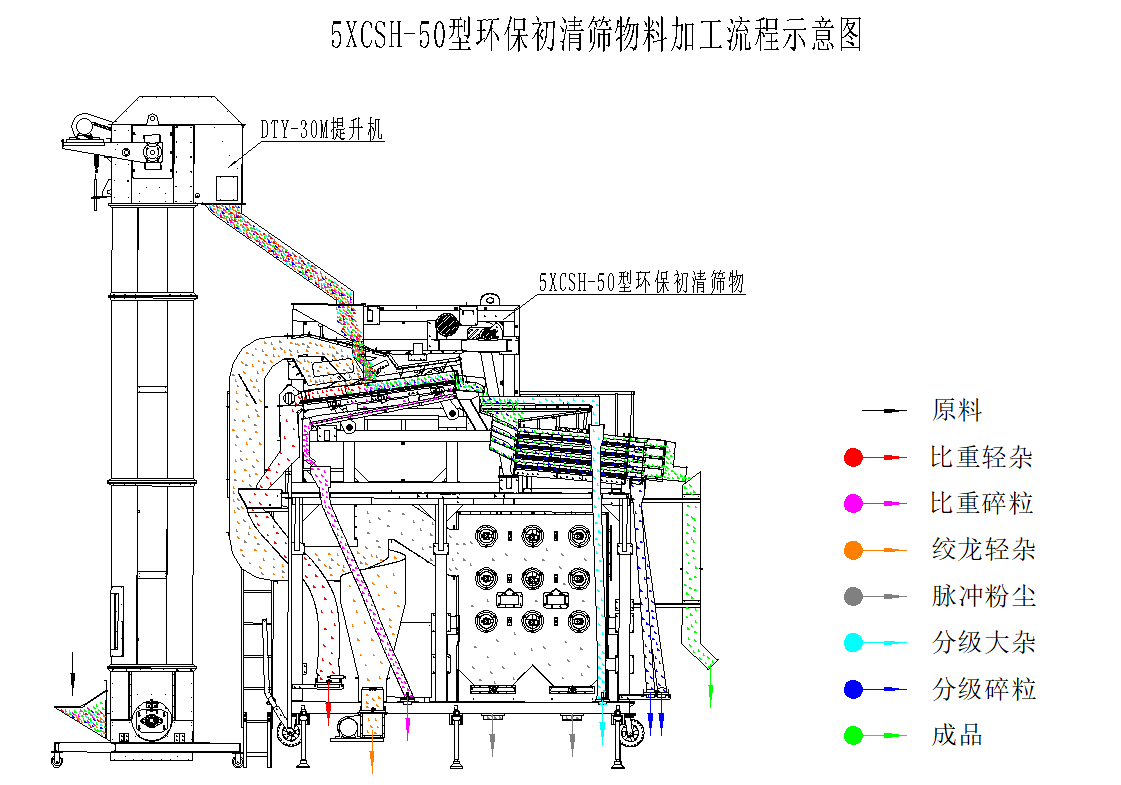 5XCSH-50環(huán)保初清篩主要由上下兩部分結(jié)構(gòu)組成,其中上部分功能為臥式比重風選、分級,下部分功能為二級除塵;物料首先經(jīng)喂入斗進入臥式風選比重臺,通過臥式比重風選分離去除物料中的粉塵、糠殼、碎秸稈、玉米軸芯等輕雜,其中含塵氣體經(jīng)旋風除塵器完成一級除塵,去除粉塵、糠殼等輕雜,經(jīng)過一級除塵的細小粉塵空氣進入脈沖除塵器完成二級除塵,去除更細小的粉塵,達到合規(guī)潔凈排放。臥式比重風選分離后的物料進入一層大雜篩去除大雜,然后并行進入四層小雜篩去除小雜,排出成品。